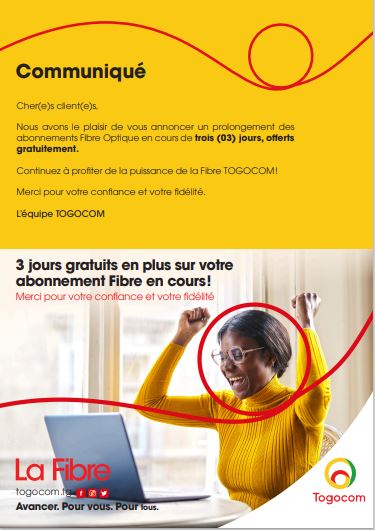 En vue de permettre à sa clientèle d’effectuer la navigation Internet dans une quiétude, le groupe Togocom annonce une bonne nouvelle: << cher (e) s client(e) s, nous avons le plaisir de vous annoncer un prolongement des abonnements fibre optique en cours de trois jours offerts gratuitement>>, a informé Togocom à travers un communiqué publié